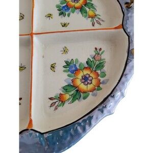 Gorgeous blue luster edging. No chips or cracks. Beautiful Handpainted flowers in each of the 4 sections. Rattan Handle.
