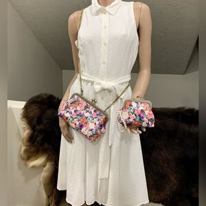 •The small clutch is very cute and exquisite, can hold cosmetic items, keys, bank cards, coins. Silver tone hardware, includes wristlet pearl chain.