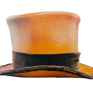 Vintage Handstitched Tan Leather Top Hat with Velvet Trim, Unique Steampunk