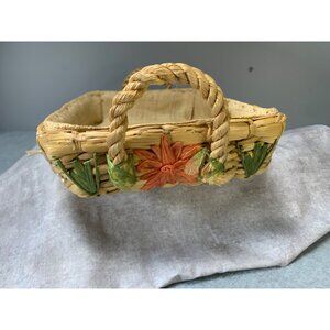 Vintage Handwoven Rattan Basket with Floral Embellishments Burlap Liner 11x7 19