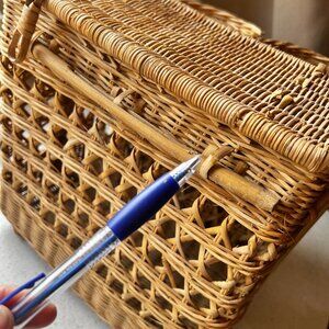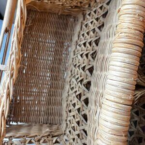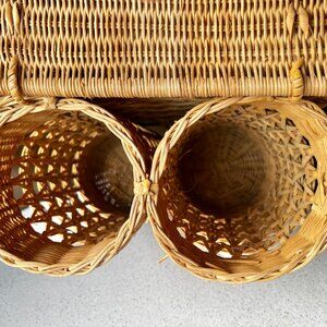 This handwoven rattan picnic basket with double bottle holder caddy features a sturdy bamboo handle, offering a practical and stylish solution for transporting bottles. Its intricate weaving and natural wicker materials provide an elegant aesthetic, suitable for both indoor and outdoor settings. Missing one of the rattan closures. See photo for details. Still functional.