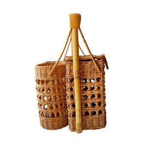 Vintage Handwoven Rattan Bottle Holder Caddy With Bamboo Handle