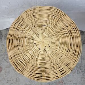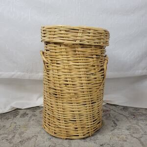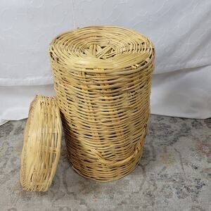 Vintage Handwoven Round Bamboo Wicker Hamper 20x14 Natural Toned Basket with Lid