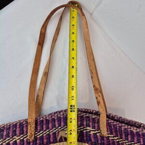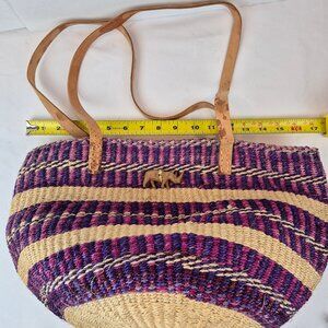 Vintage Handwoven Sisal Tote Market Bag from Kenya. Handwoven African bag. Beautiful purple and light beige earth tones.Two natural leather straps. Small wooden rhino figure at the front. Durable and versatile. Great for farmers market runs, grocery, weekend getaways, travel or everyday use. Preowned with some light wear- stains on the straps, strap wear at one area, light fading. Please see pictures for approximate measurements. Festivals, hippie, boho, Bohemian, African, Kenyan, market bag, earthy, beach bag, shopping, satchel, woven Kenyan. tote, sustainable.