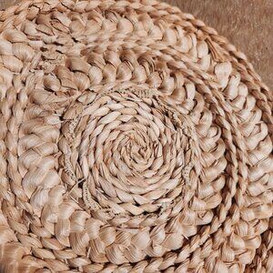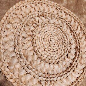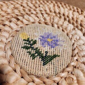 These vintage coasters, crafted from straw, feature intricate needlepoint floral designs. They bring a touch of rustic charm and artistry to any setting.