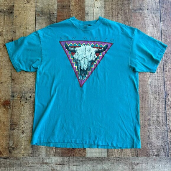 Vintage Hanes Beefy T Shirt New Mexico Bull Skull Graphic Teal XL Made in USA 1994
