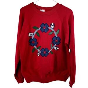 Vintage Hanes Floral Sweatshirt Embroidered Crew Oversized 100% Cotton Red Large