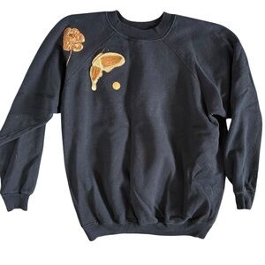Cozy vintage Hanes sweatshirt with gold-toned appliqué butterflies, florals, and dot details. Black base with a bold front and subtle back design. Made in the USA, soft 50/50 cotton acrylic blend, and tagged a size Large.