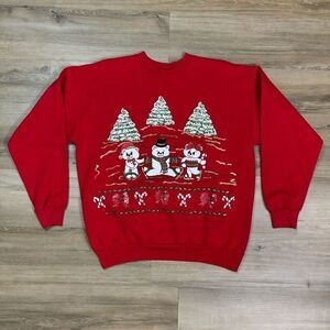 Vintage Hanes L Iceskating Christmas Bears Crewneck Sweatshirt Red Winter Retro