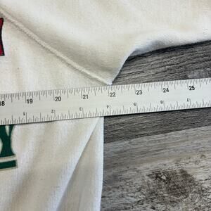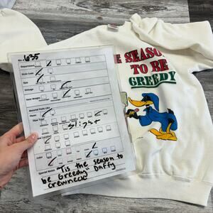 Vintage Hanes Tis The Season To Be Greedy Daffy Duck White Green Red Men's Large Sweatshirt long sleeve raglan cut boxy crewneck holiday Christmas chest graphic elasticized cuff and hem fleece lining cotton polyester lightweight pullover comfy cozy classic casual sweater made in USA, slightly stained on front