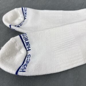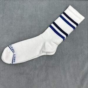 Listed is a vintage Hanes tube sock, with 2 black and blue stripes on calf. White body. Feels like a cotton blend fabric. Hanes logo on toes. Mens.
