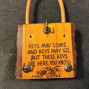 Vintage hanging wood keyholder. Has three metal pegs for keys and two additional holes if you wish to add more pegs. Says: "Keys may come and keys may go, but these keys are here you know"