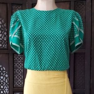 Vintage Handmade Green & White Hankerchief blouse Beautifully made! Short sleeves with adorable overlaping detail Back button up connected at bottom Stretchy bottom with a couple of open spots where you can see the stretchy fabric, not noticeable when wearing noticed while photographing. Measurements Flat: Small/ Medium maniquin is a small, & top is pinned back a bit for shots Bust: 21" Bottom: unstretched 16.5" Top shoulder down: 16.5" Great versatile piece