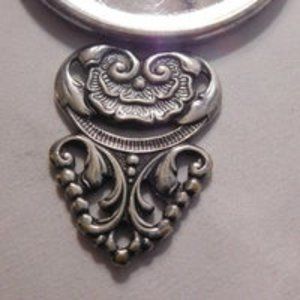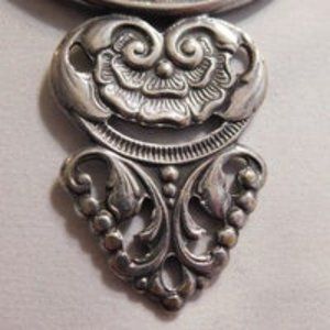 Features a pretty folk art picture on the back. The silver metal still has a nice shine to it. Nice ornate design handle.