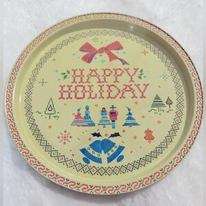 Vintage metal Happy Holiday Christmas Serving decorative Tray Cookie Dessert Plate. Cottagecore Farmhouse Traditional classic Christmas decor. Great condition, a few small scratches on the back of the tray as shown in pics. Smoke & pet free home. Bundle to save - I have lots of vintage Christmas decorations!