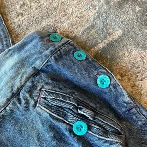 Vintage Happy Kids Blue Jean Bow Suspender Overalls. Toddler girl size 4T. 90s perfection! Suspender style denim overalls with adjustable button straps, elasticized waist with buttons on the side, and multiple button pockets. Fun bow details on the legs and stirrup straps at the feet. (Some visible wear; not sure how functional they are, but so cute all the same! See last photo for strap with more wear.)