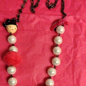 Vintage Harajuku Lovers Necklace to add a playful touch to your outfit with this adorable white beaded necklace with pink pompoms.