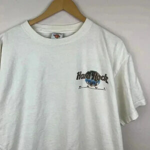 Elevate your casual wardrobe with this vintage Hard Rock Cafe graphic tee. Made from soft, breathable fabric, this shirt offers comfort and style in one package. Its classic white color and iconic Hard Rock logo make it a standout piece, perfect for layering or wearing on its own.