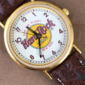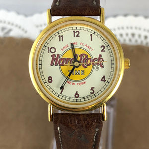 Vintage Hard Rock Time Cafe Watch Gold & Brown 9 inch Leather Strap Gold Tone Case Stainless Steel New Battery Like New Save the Plant Recycle Re Purchase