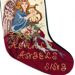 Vintage Hark the Herald Angels Sing Christmas Needlepoint Stocking Velvet Back