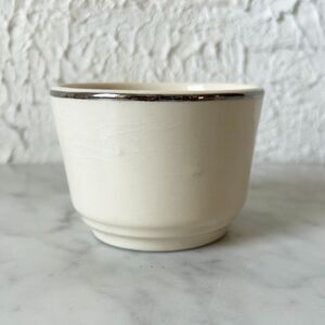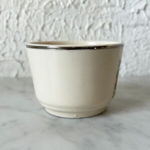 Vintage Harker Pottery Hotoven custard dessert cup. Floral Petit Point pattern is on one side of the cup and there is metallic trim around the top. There is a blemish on the lip, shown in close up photo. Cup is 2-1/8" high.