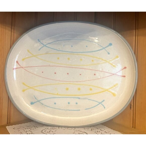 Vintage Harkerware Seafare Oval Serving Stoneware Ceramic Platter Mid Century Abstract Design Oven Proof 1960s