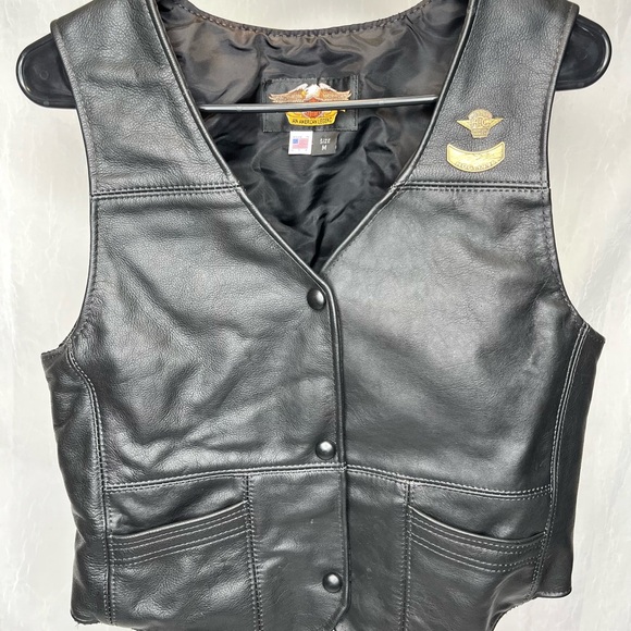 Vintage Harley Davidson 1996 Black Leather Vest Pins Biker Women’s Size M USA