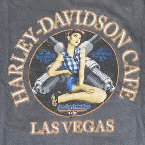 This vintage Harley Davidson Cafe T-Shirt is a stylish and nostalgic piece for any biker or motorcycle enthusiast. Made from cotton, this regular fit t-shirt features a graphic print design in black and gray tones, perfect for a casual and edgy look. With its 90s style and Las Vegas theme, this t-shirt is both comfortable and on-trend, making it a must-have addition to any man's wardrobe. Whether you're a Harley-Davidson fan or just love a good biker-inspired tee, this vintage shirt is sure to make a statement.