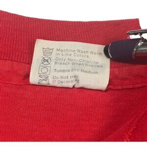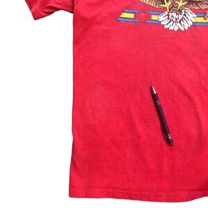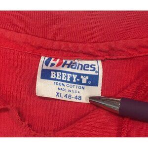 This vintage red Harley-Davidson t-shirt is a true free-spirited classic, featuring a bold front graphic of a soaring eagle and “Harley-Davidson Free Spirit” text in vivid retro colors. Made in the USA on a Hanes Beefy-T 100% cotton tee (tagged XL 46–48), the shirt is soft, worn-in, and perfectly distressed around the collar for that authentic lived-in vintage vibe. The back showcases a white graphic for Michael’s Cycle Service in Jacksonville, Florida, complete with an illustrated motorcycle and contact number—giving it genuine 80s/90s biker-shop appeal. A standout piece for collectors or fans of American motorcycle culture.