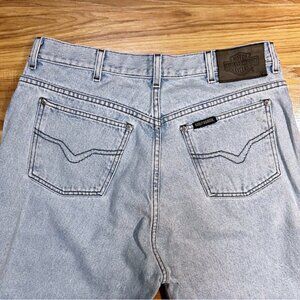 This is a pair of Vintage Harley Davidson Men's Light Wash Relaxed Fit Straight Leg Jeans are 18" across the front waist, 23 1/2" across the front hips, have a 12 1/2" rise and a 31 1/2" inseam.