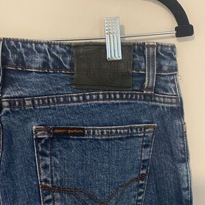 Classic denim jeans featuring Harley-Davidson logo. Perfect for casual outings.
