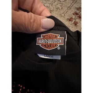 -This vintage Harley-Davidson women's sleeveless T-shirt is a must-have for any motorcycle enthusiast. The black shirt features rhinestones that add a touch of sparkle to any outfit. It is made by a famous brand and is a size large.