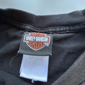 Rev up your biker style with this classic Harley Davidson BlueStone Wash T-shirt. This pre-owned tee in size L features a solid pattern, short sleeves, and a crew neckline with pullover closure. The gray cotton fabric is dark-washed and adorned with a double-sided graphic print of the iconic Harley Davidson logo, making it perfect for any season and occasion.