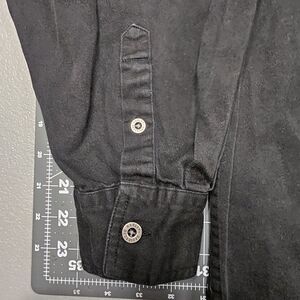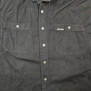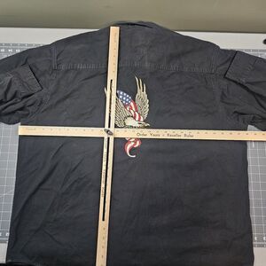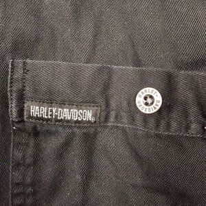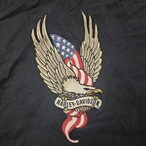 Vintage, November 2002, embroidered Harley-Davidson button-down shirt men's XXL in black. Eagle logo embroidered on the back. The top collar button is missing. Otherwise, it's in excellent condition with no flaws or defects. 2371