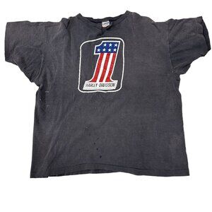 This vintage Champion XL Harley-Davidson T-shirt features the iconic #1 USA flag logo on the front and Gainesville, Florida dealer graphics on the back. Made in the USA from 100% cotton, this black single-stitch tee shows natural fading, wear, and small marks, giving it that authentic, broken-in biker style collectors love. Perfect for vintage Harley and Champion fans alike, this rare piece captures true 80s–early 90s motorcycle culture in a soft, well-worn fit.