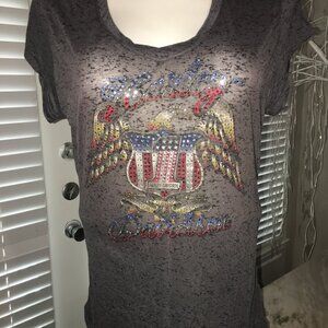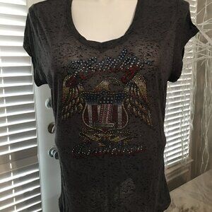 Dark Gray or light black t shirt, this is very thin, almost see through fabric, but strong just lightweight. Great pretty logo will fit up to 32 bust