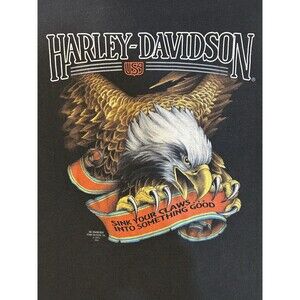 Rare 1991 Harley-Davidson 3D Emblem tee featuring a bold eagle graphic on soft single-stitch cotton. Excellent used condition with no pinholes, stains, or cracking on the print. Made in USA.