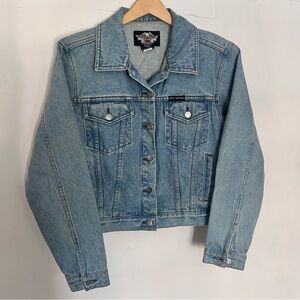 Classic light blue denim with iconic Harley-Davidson patch. Perfect for casual wear. Cropped fit is perfect for the petite girlies.
