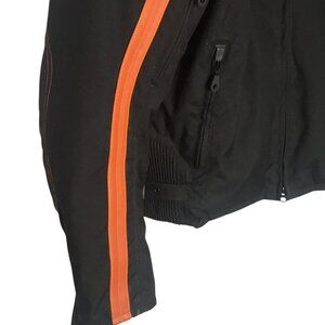 Brand: Harley-Davidson Clothes motorcycle jacket with bold orange stripe accents and embroidered HARLEY-DAVIDSON logos front and back.
