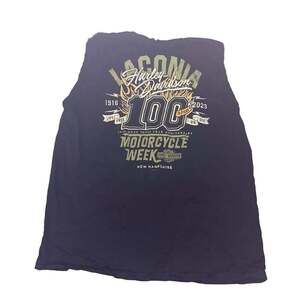 Vintage Harley-Davidson Motorcycles Sleeveless T-Shirt, black with orange and green graphics, size XL. Features a classic Harley-Davidson logo on the front and a commemorative "Laconia Harley-Davidson 100th Year Anniversary Motorcycle Week 1916-2023" design on the back. Made from comfortable cotton. Excellent pre-owned condition with no significant flaws. Perfect for motorcycle enthusiasts and fans of vintage Americana. Sold out online.