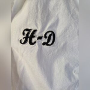 Channel classic biker style with this authentic Harley-Davidson women’s sleeveless button-up shirt. Crafted in crisp white cotton with black piping detail, this top features a bold embroidered “H-D” monogram on the front and the iconic Harley-Davidson winged logo on the back.