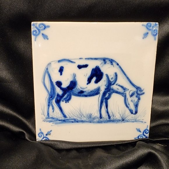 Vintage (circa 1984) signed Harlingen Holland Delft tile of a cow. Materials: clay, ceramic, glaze. Approx. measurements: 5" x 5" x 1/4" deep. Marked as Harlingen Holland on back. Good pre-owned condition with some minor wear and tear appropriate for age. Please see photos. The photos are part of the description.