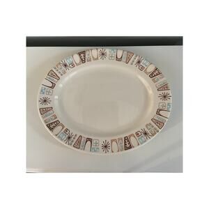 The Vintage Harmony House MCM Marimba Bay Atomic Pattern Oval Serving Tray is a unique and stylish piece of stoneware platter featuring a beautiful blue color and retro atomic pattern.