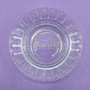 Harrah's Casino ashtray clear glass 4.5" vintage round logo. Excellent pre-owned condition with no stains, chips or cracks.