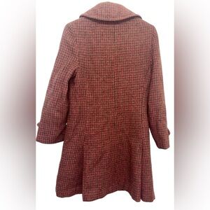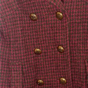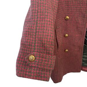 Vintage 1970s Harris Tweed Scottish Wool Houndstooth Double Breasted Pea Coat Maroon Red & Green. Gold Military Buttons. Size XS/S