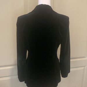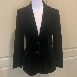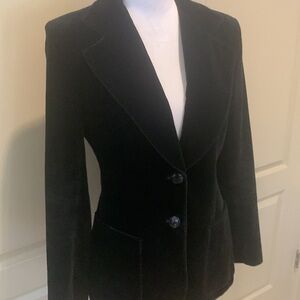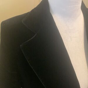 Vintage Herrods jet black velvet jacket size small. Two beautiful black buttons and close the front. This is vintage! Two large front pockets and lined beautifully in polyester. No tags to report the true size or material. 18 inches from pit to pit and 30 inches in length. This is a rare find! Pristine condition!