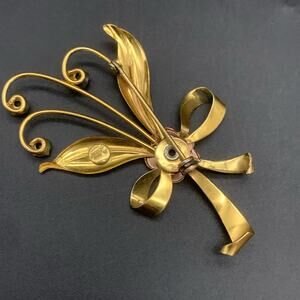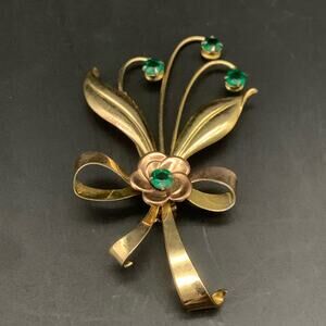 Vintage Harry Iskin Floral Flower Brooch Gold Filled Green Rhinestone Crystals Signed