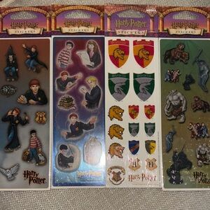 Set of Harry Potter themed stickers featuring characters and house crests. Includes vibrant designs and iconic imagery.