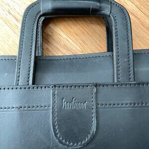 Vintage Hartmann black leather Briefcase - slim 4" wide design with several sections for organizing. Retractable handles with two deep exterior pockets. Heavy luggage leather with a few scuff marks - rarely used. Size 16.5" W x 11" H x 4" W. Slim laptop/tablet/phone easily fit inside.