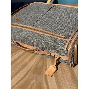 This is a stunning vintage Hartmann tweed and leather garment bag, showcasing the brand's hallmark quality and style. A perfect find for collectors or anyone seeking sophisticated travel gear.